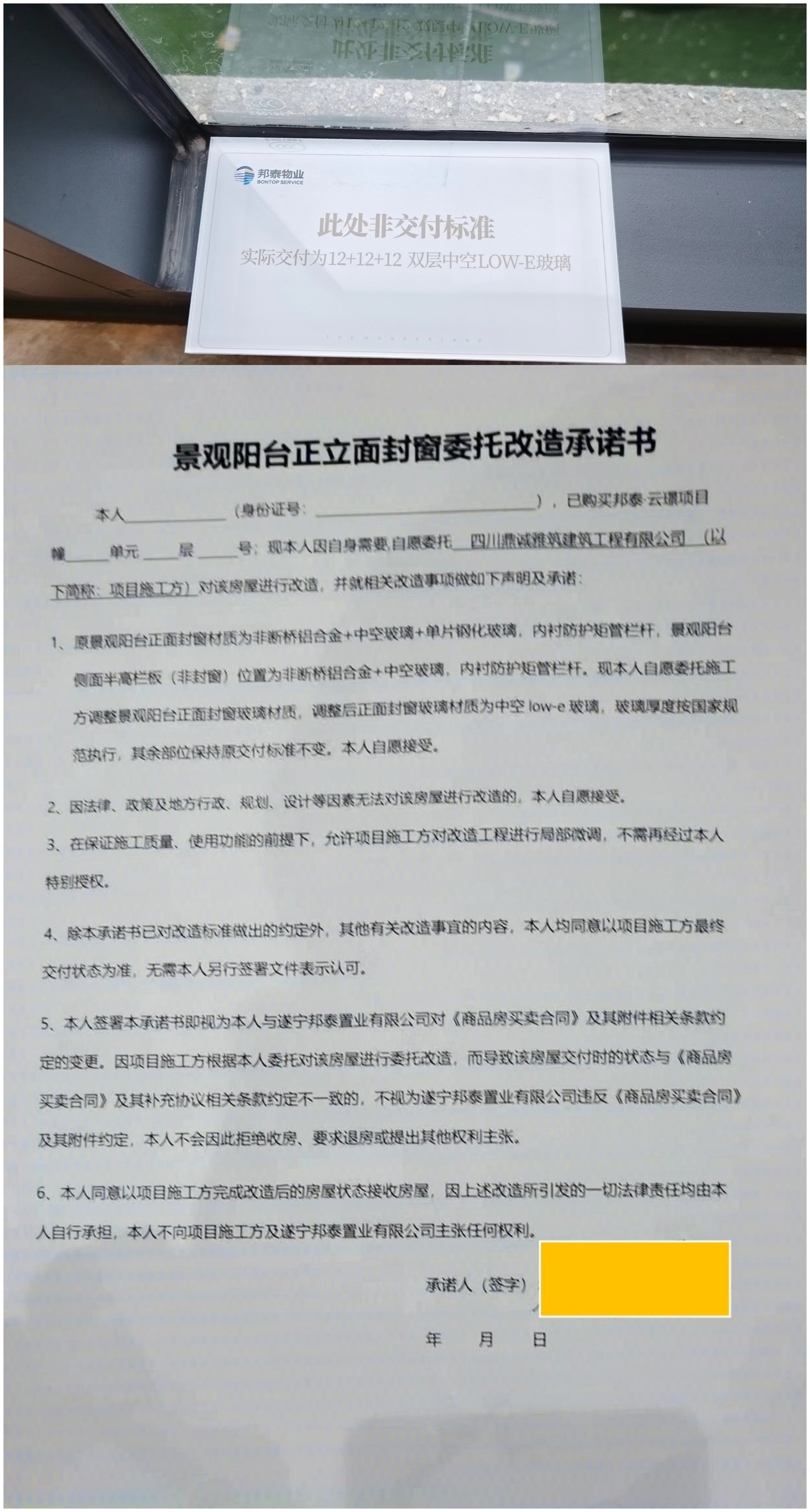 | 来信标题 | 关于邦泰置业未按承诺安装“邦泰云璟南区”项目阳台玻璃的投诉 |