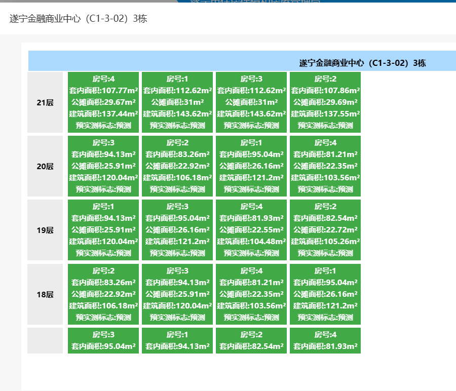 近日,我登陆遂宁市商品房预售公示系统查询佳乐荷韵小区商品房的销售相关信息,发现所有住房都显示为绿色,这应该代表着未出售的状态,然后发现其他楼栋以及其他小区也是如此。这是系统bug还是以后不会再公示商品房是否出售信息了。