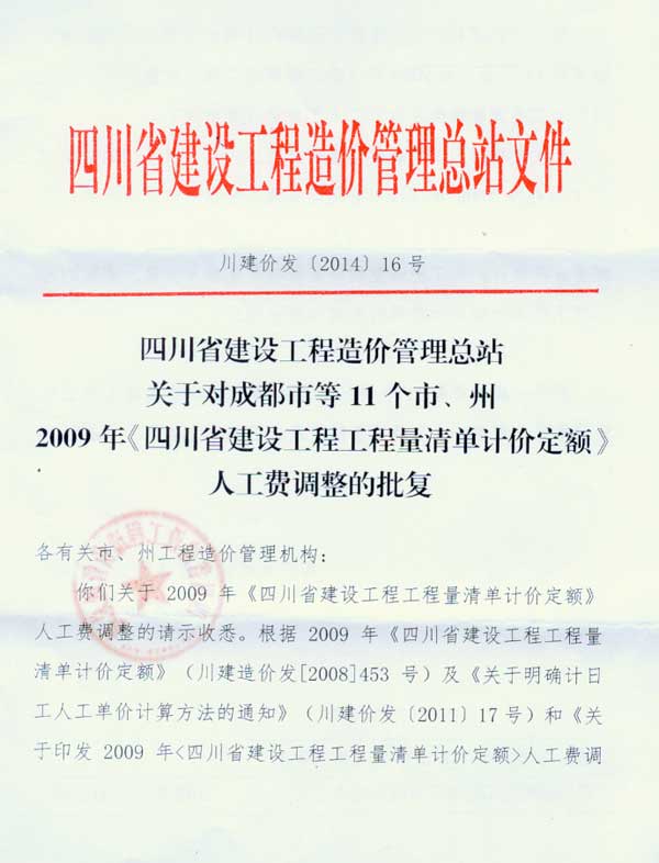 关于对成都市等11个市、州2009年《四川省建设工程工程质量清单计价定额》人工费调整的批复