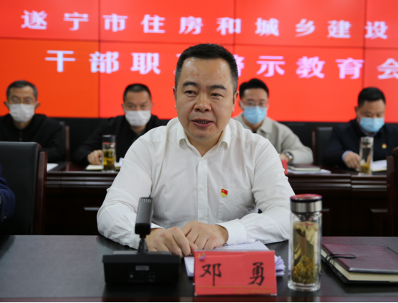 20221117日下午,遂宁市住房城乡建设局召开干部职工警示教育大会。全体局领导班子成员、机关科室和局属单位副科职以上干部、重点风险岗位人员参加会议。局党组书记、局长邓勇参加会议并作讲话。