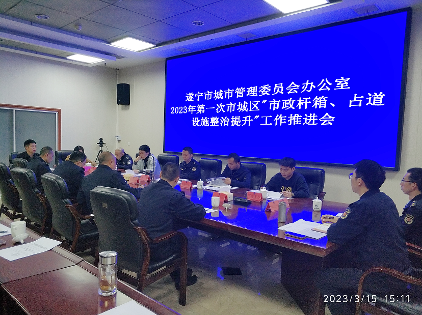 2023年3月15日,遂宁市城市管理委员会办公室召开2023年第一次市城区“市政杆箱、占道设施整治提升”工作推进会,市城管办副主任、市城管执法局副局长陶敏主持会议,市直相关部门、辖区城管办和企业参加会议。