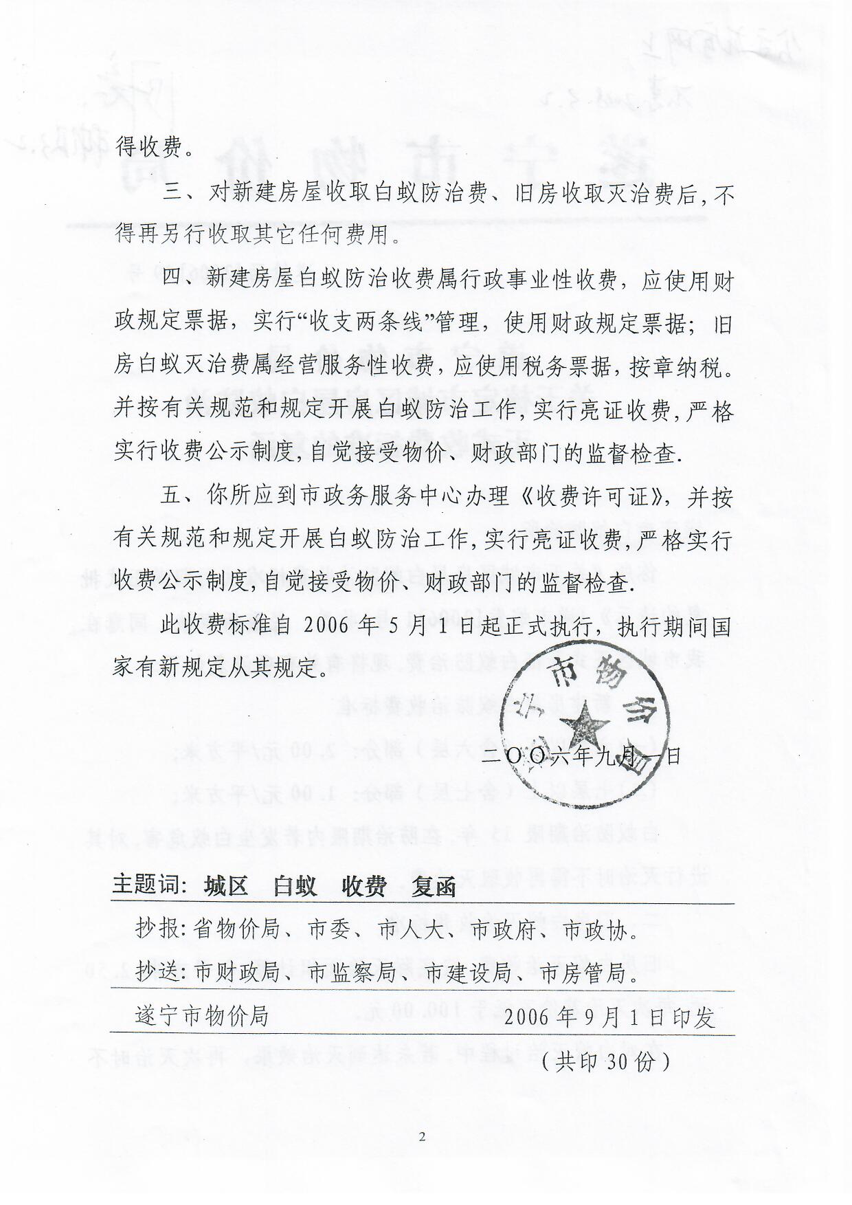 关于核定市城区房屋白蚁防治正式收费标准的复函 遂价函【2006】99号
