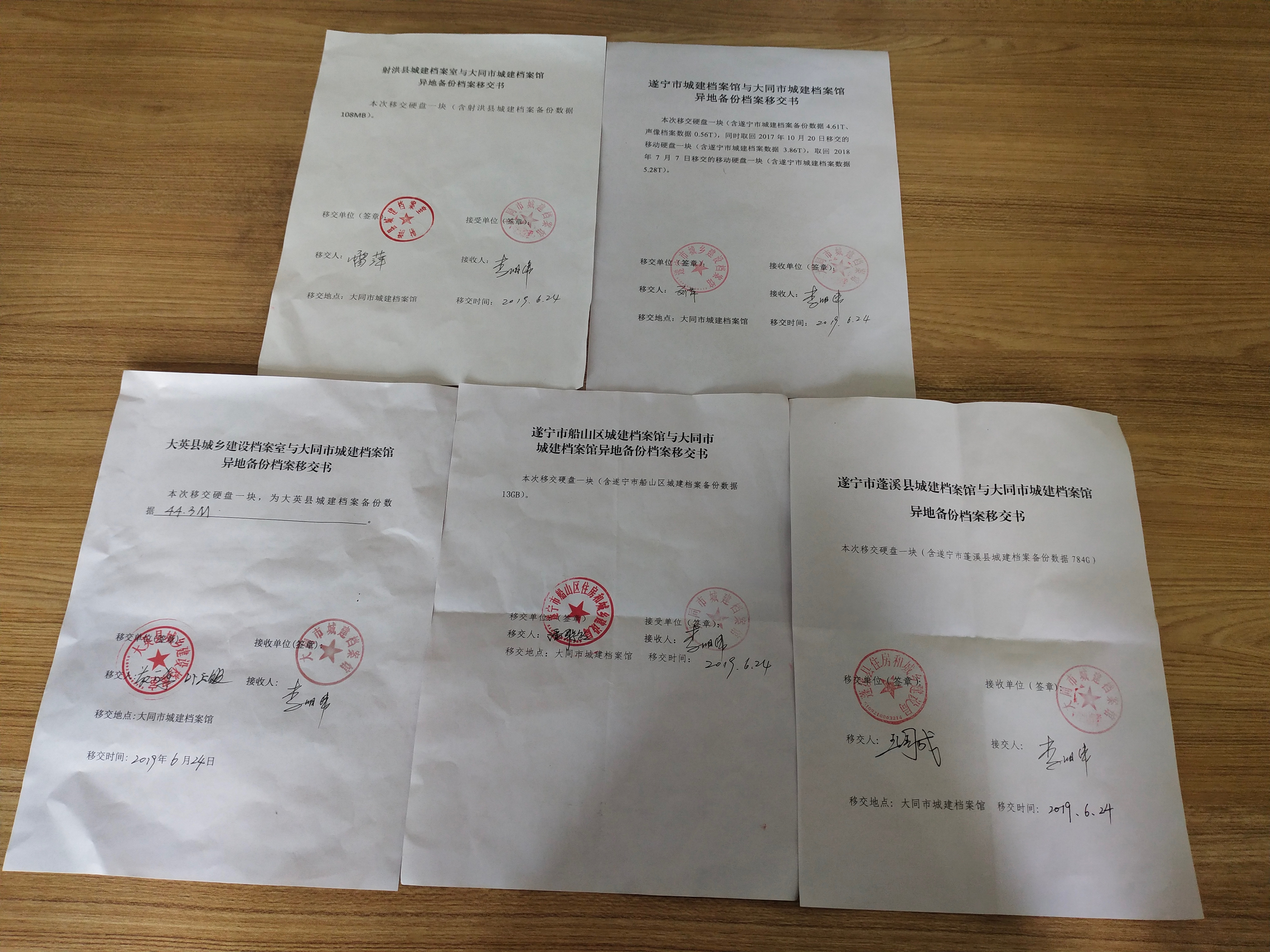 为进一步加强我市城建档案存储安全和异地异质备份工作,确保城建档案信息资源在应对突发事件、自然灾害、抢险救灾等方面发挥重要作用,近日,市城建档案馆同射洪县、蓬溪县、大英县、船山区城建档案室相关工作人员,赴山西大同市城建档案馆开展省外档案数据异地异质备份交接工作。