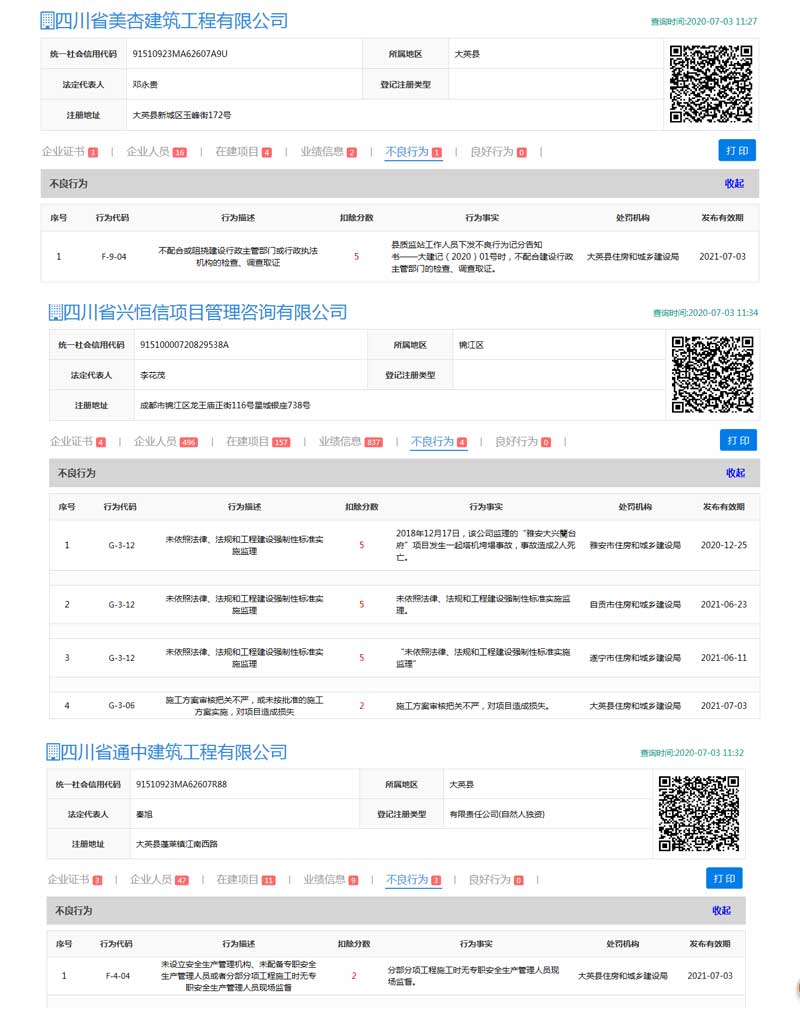 对本次检查中企业履责、人员到岗、隐患排查等问题突出的四川省通中建筑工程有限公司、四川省美杏建筑工程有限公司、四川省兴恒信项目管理咨询有限公司予以全县通报批评并实施诚信处理挂网公示(截图附后)。