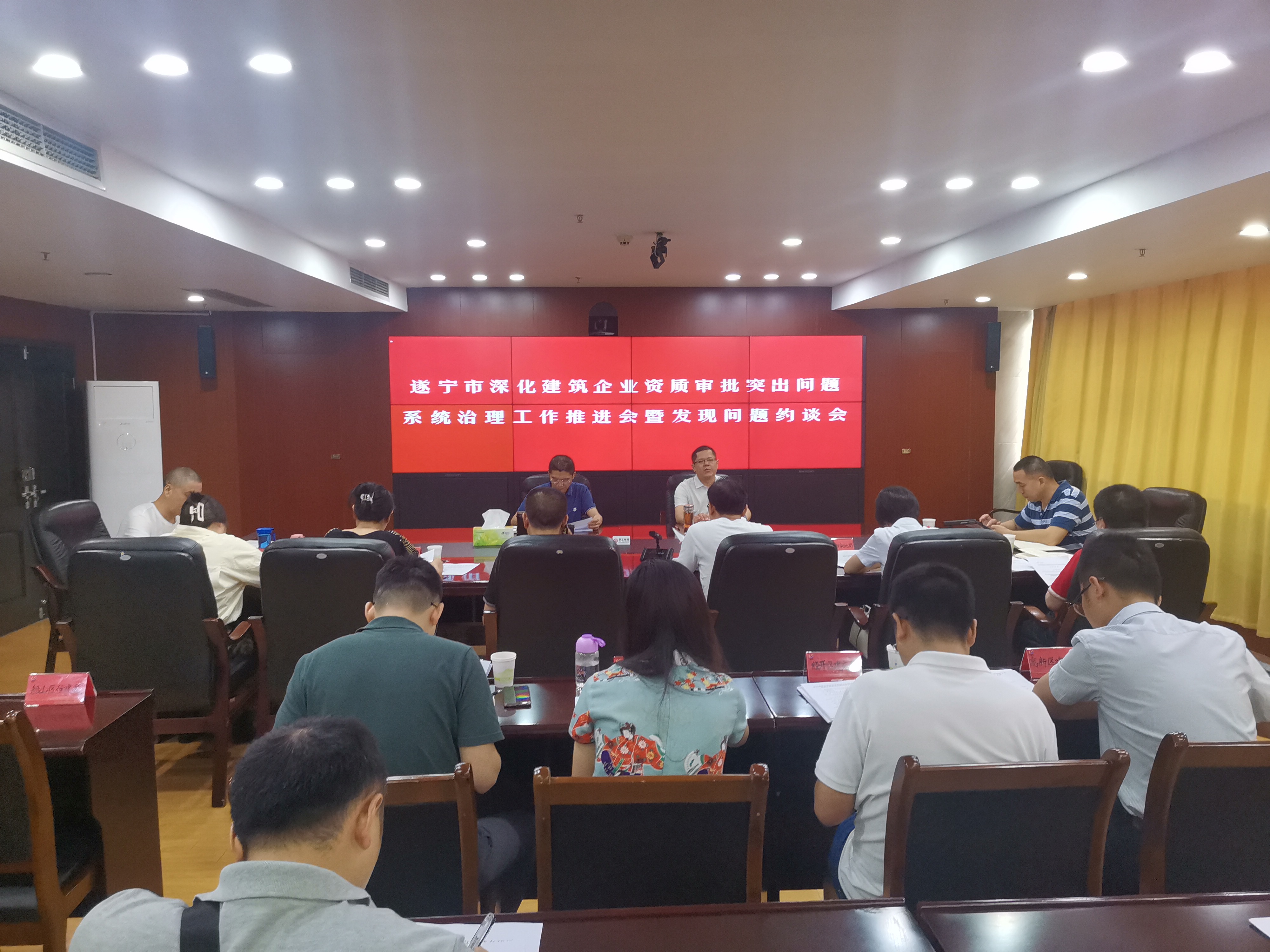 6月29日上午,市住房城乡建设局副局长唐静组织召开全市深化建筑企业资质审批突出问题系统治理工作推进会暨发现问题约谈会,各县(市、区、市直园区)建设行政主管部门、射洪行政市审批局分管领导及经办人员和局行政审批科、建管科、人事科、设计科、机关纪委负责人参加会议,市纪委监委驻市住建局纪检组组长蒲岸到会进行指导。
