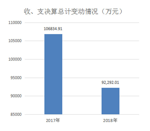 2018年度收、支总计92,292.01万元,与2017年相比,收、支总计均减少14,542.9万元,下降13.61%。主要原因是本年无海绵城市建设专项资金。