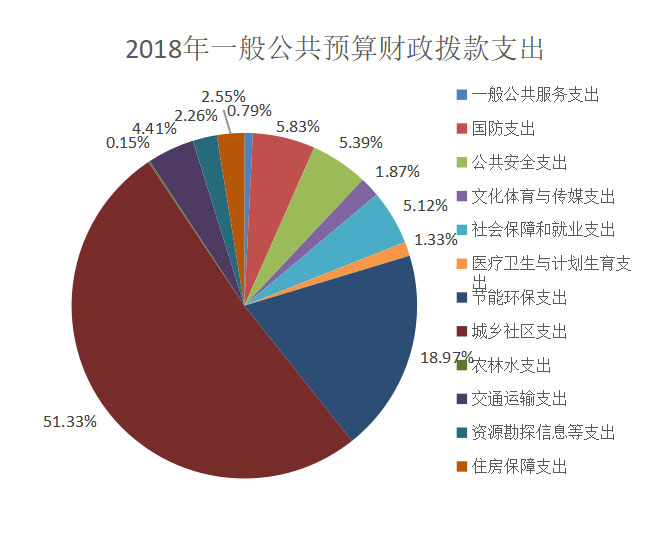 2018年一般公共预算财政拨款支出17,500.72万元,主要用于以下方面:一般公共服务支出138.06万元,占0.79%;国防支出1,019.45万元,占5.83%;公共安全支出943.90万元,占5.39%;文化体育与传媒支出327.96万元,占1.87%;社会保障和就业支出896.51万元,占5.12%;医疗卫生与计划生育支出232.23万元,占1.33%;节能环保支出3,319.60万元,占18.97%;城乡社区支出8,982.45万元,占51.33%;农林水支出26.99万元,占0.15%;交通运输支出772.16万元,占4.41%;资源勘探信息等支出395.8万元,占2.26%;住房保障支出445.62万元,占2.55%。
