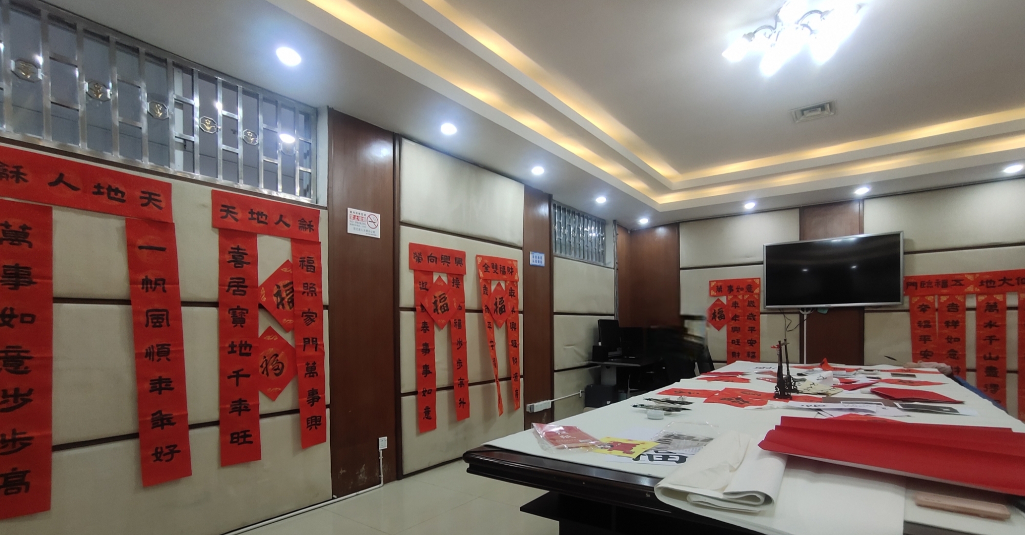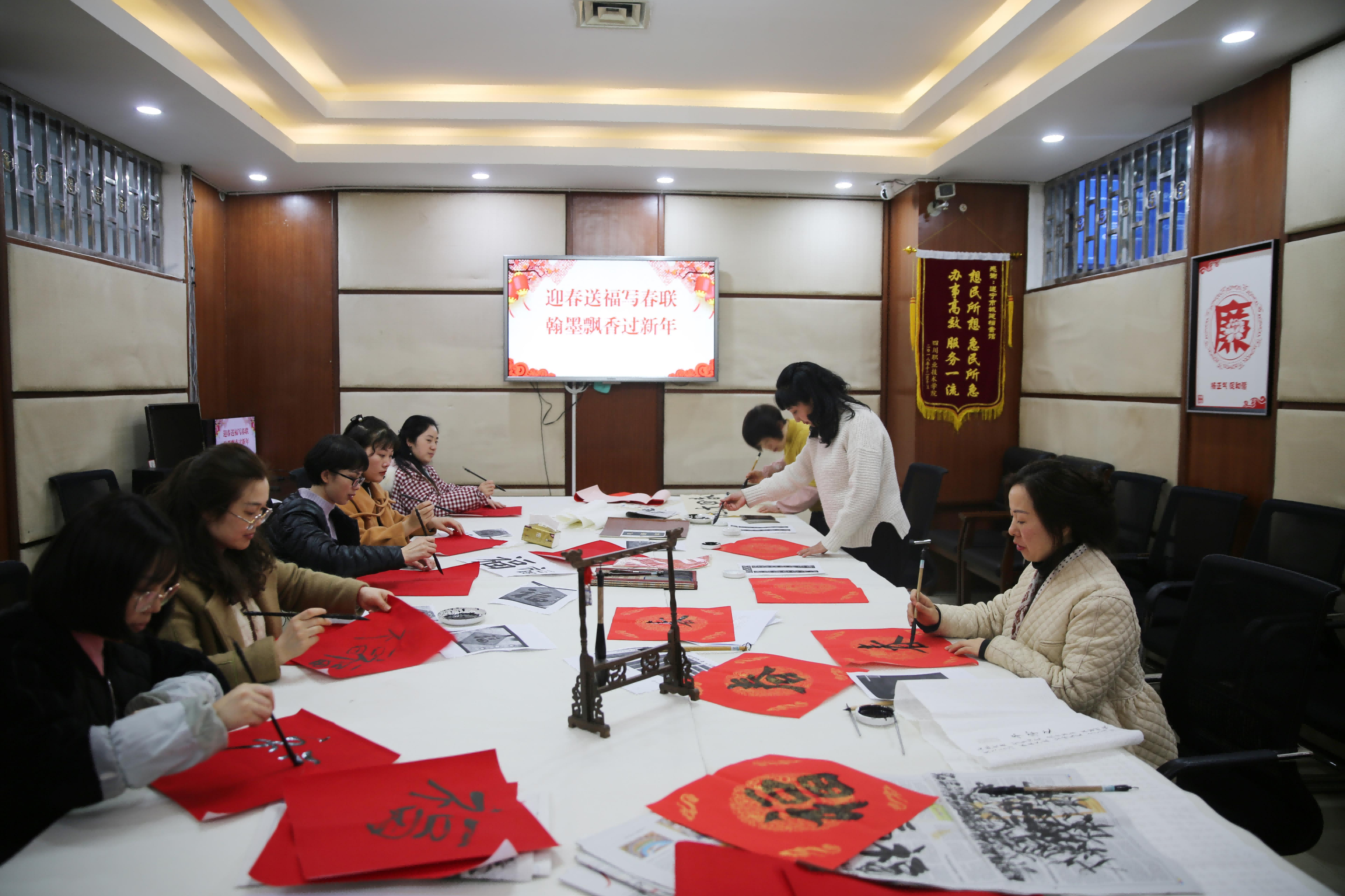 长桌铺开,笔墨备就。全体干部职工,热情洋溢,兴致勃勃,摆开书案,摊开红纸,尽情地挥洒笔墨,写下新春的祝福。“岁岁平安福寿多,年年兴旺财源广”“一帆风顺年年好,万事如意岁岁高”“福照家门万事兴,喜居宝地千年旺”……一幅幅散发着清新墨香的喜庆大红春联展现在眼前,一排排红艳艳春联与一张张“福”字构成了一番别有韵味的文化风景。