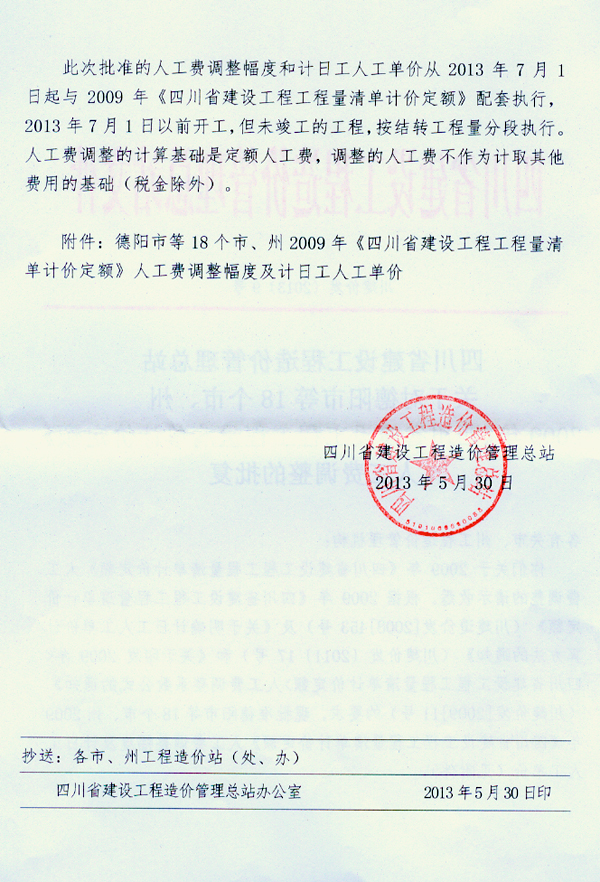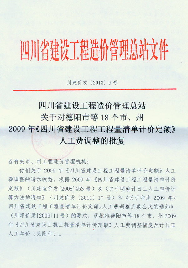 四川省建设工程造价管理总站关于对德阳市等18个市、州2009年《四川省建设工程量清单计价定额》人工费调整的批复
