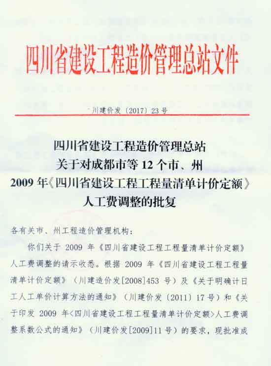 关于对成都市等12个市、州2009年《四川省建设工程工程量清单计价定额》人工费调整的批复
