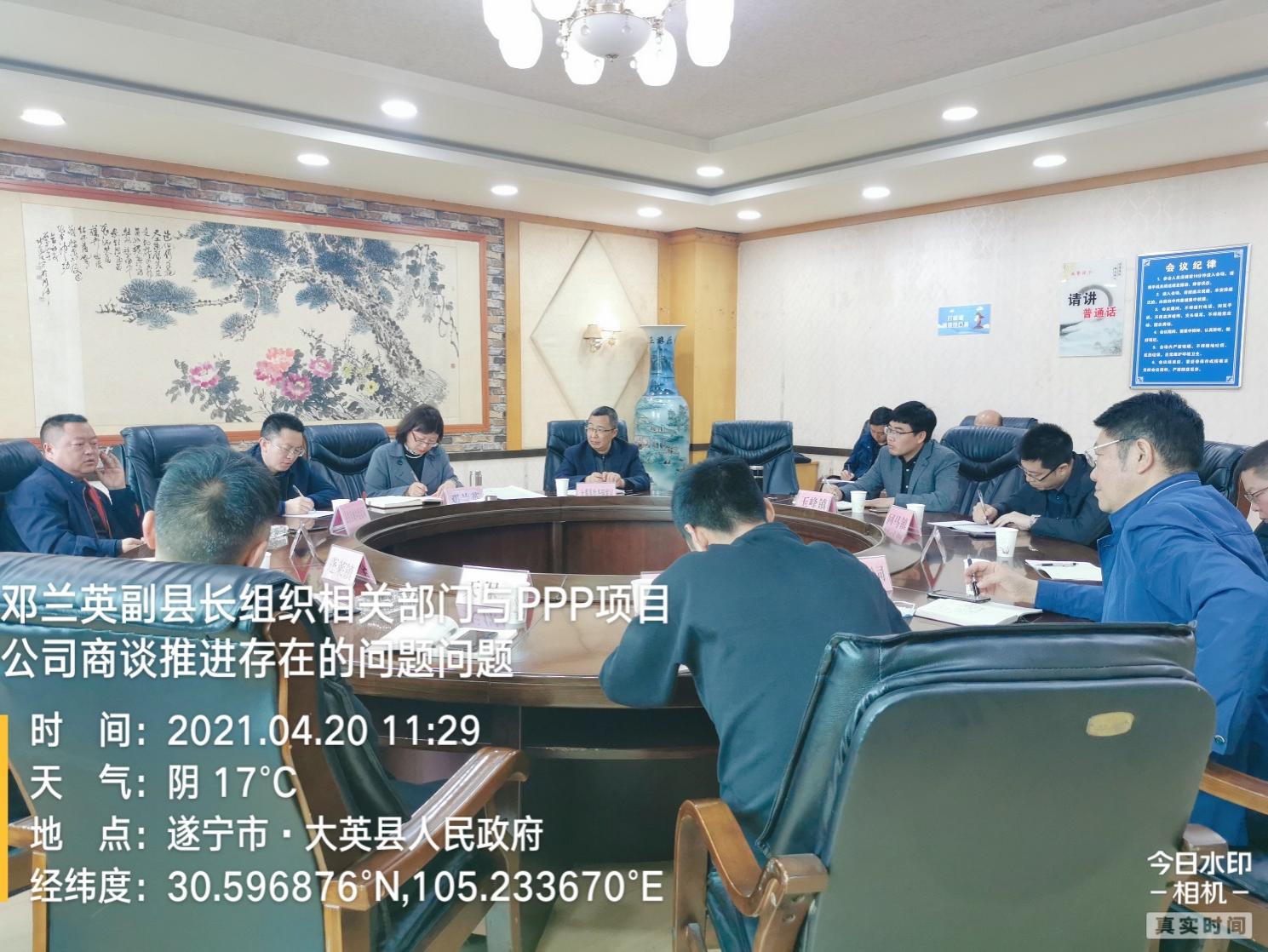 4月20日上午,邓兰英副县长主持召开了大英县城镇污水PPP项目推进工作专题会。县住房城乡建设局、大英生态环境局、玉峰镇、回马镇及项目公司等单位负责同志参加。