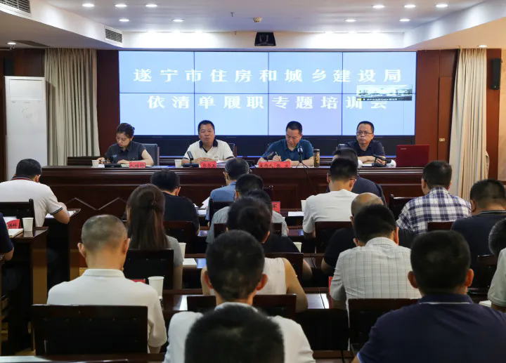 7月25日,遂宁市住房和城乡建设局举办依清单履职专题培训,市住房城乡建设局领导班子成员,机关科室、下属单位负责人及业务骨干参加现场培训,各县(市、区)、市直园区住房城乡建设主管部门领导班子成员及业务骨干参加视频培训。